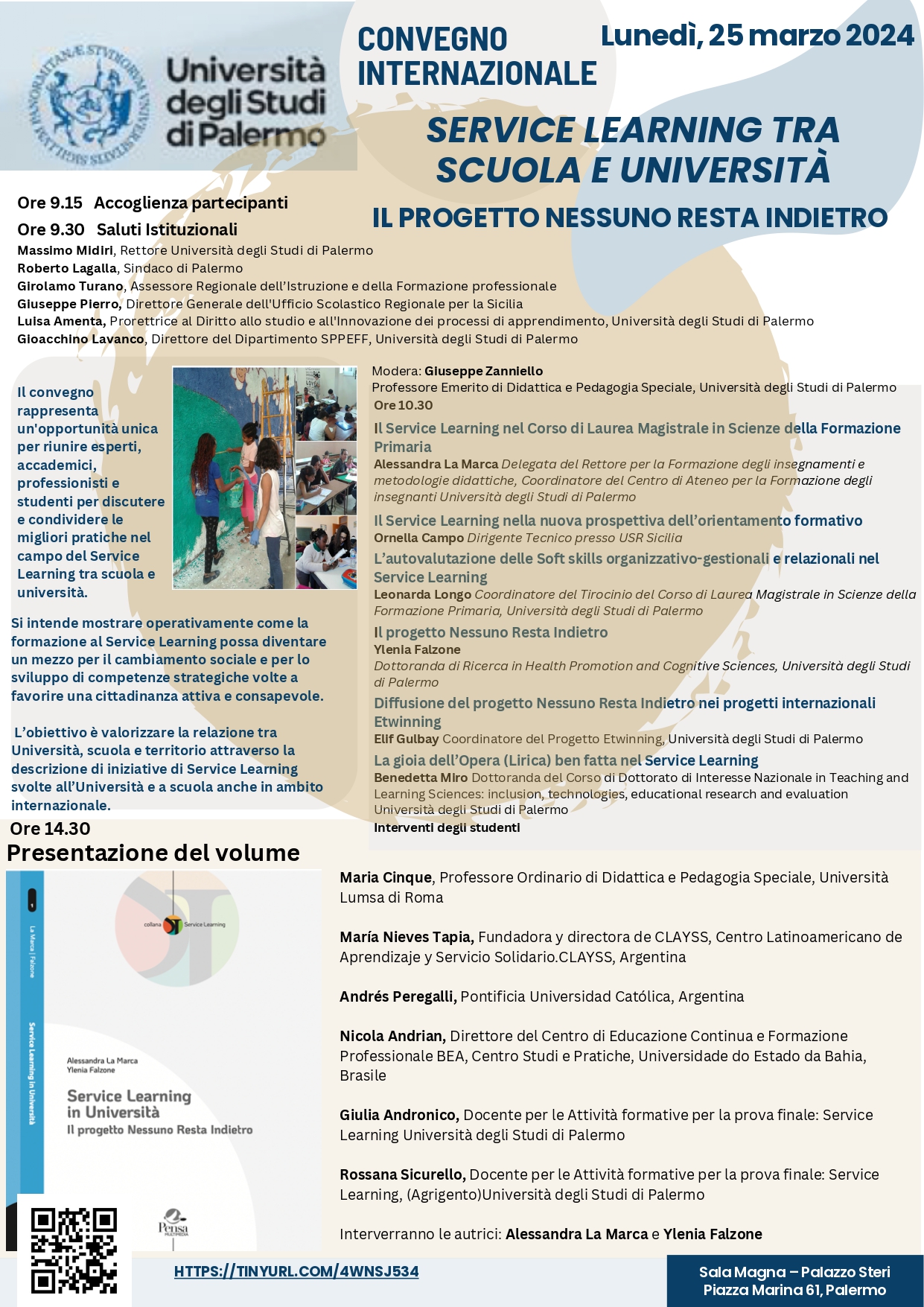 Il 25 Marzo a partire dalle ore 9:15, si svolgerà presso la Sala Magna dello Steri, Piazza Marina n.61, il Convegno internazionale "Service Learning tra scuola e università. Il progetto Nessuno Resta Indietro"