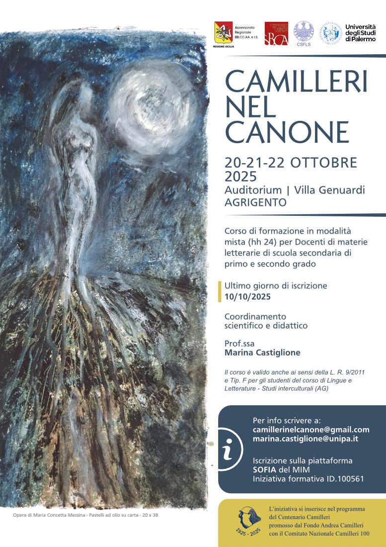 Corso residenziale intensivo presso Villa Genuardi ad Agrigento, dal 20 al 22 ottobre, per complessive 24 ore, registrato sul sito ministeriale SOFIA. 12 studiosi si interrogheranno sul valore della prosa camilleriana e sulla possibilità che essa venga assorbita nel canone scolastico, in occasione del centenario dalla nascita dello scrittore.