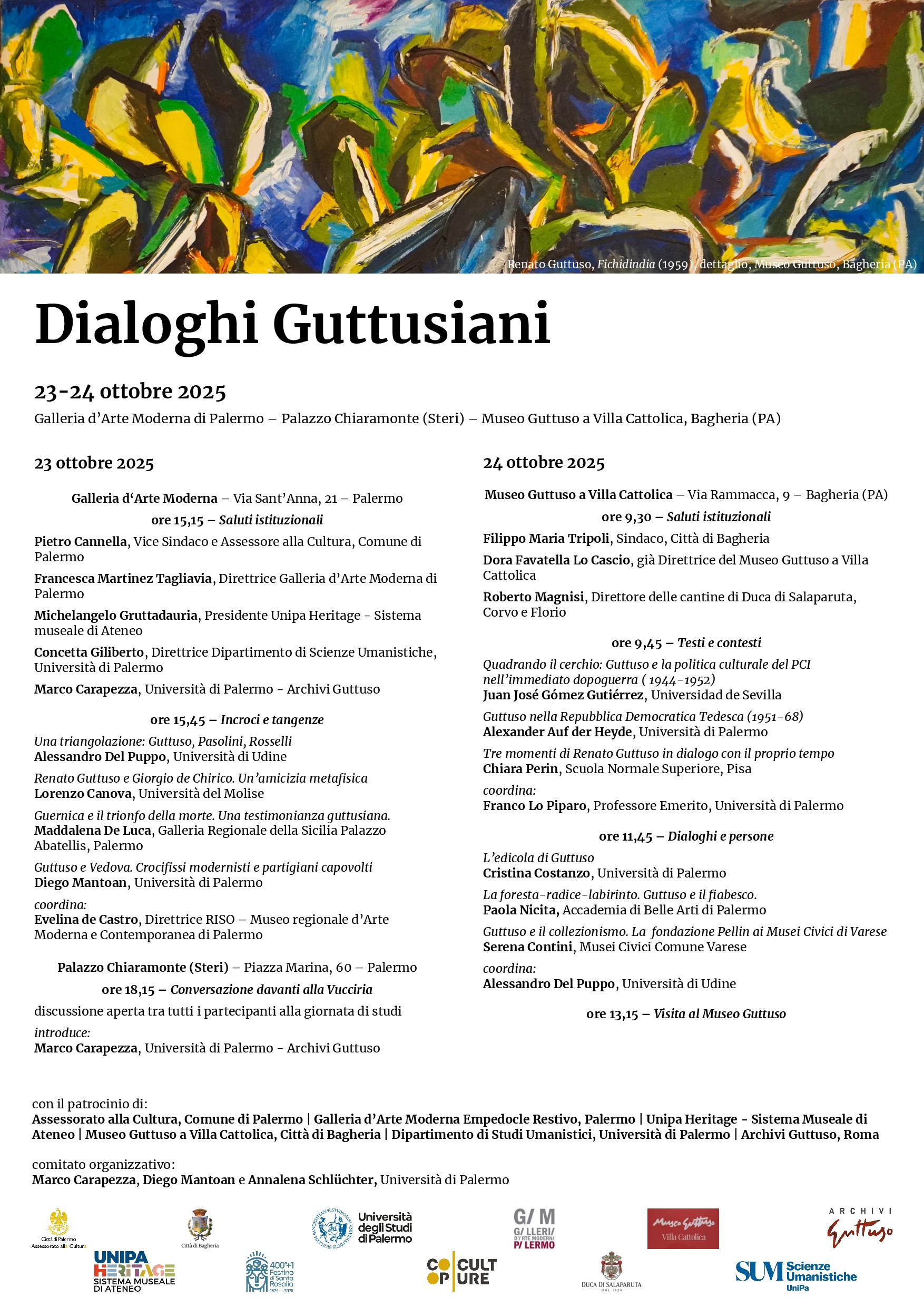 Il 23 e 24 ottobre 2025 si terrà tra Palermo e Bagheria la giornata di studi “Dialoghi Guttusiani” pensata come momento di riflessione e approfondimento sull'eredità e l’attualità di Renato Guttuso nel campo della storia dell’arte e in quello dell’arte contemporanea.
