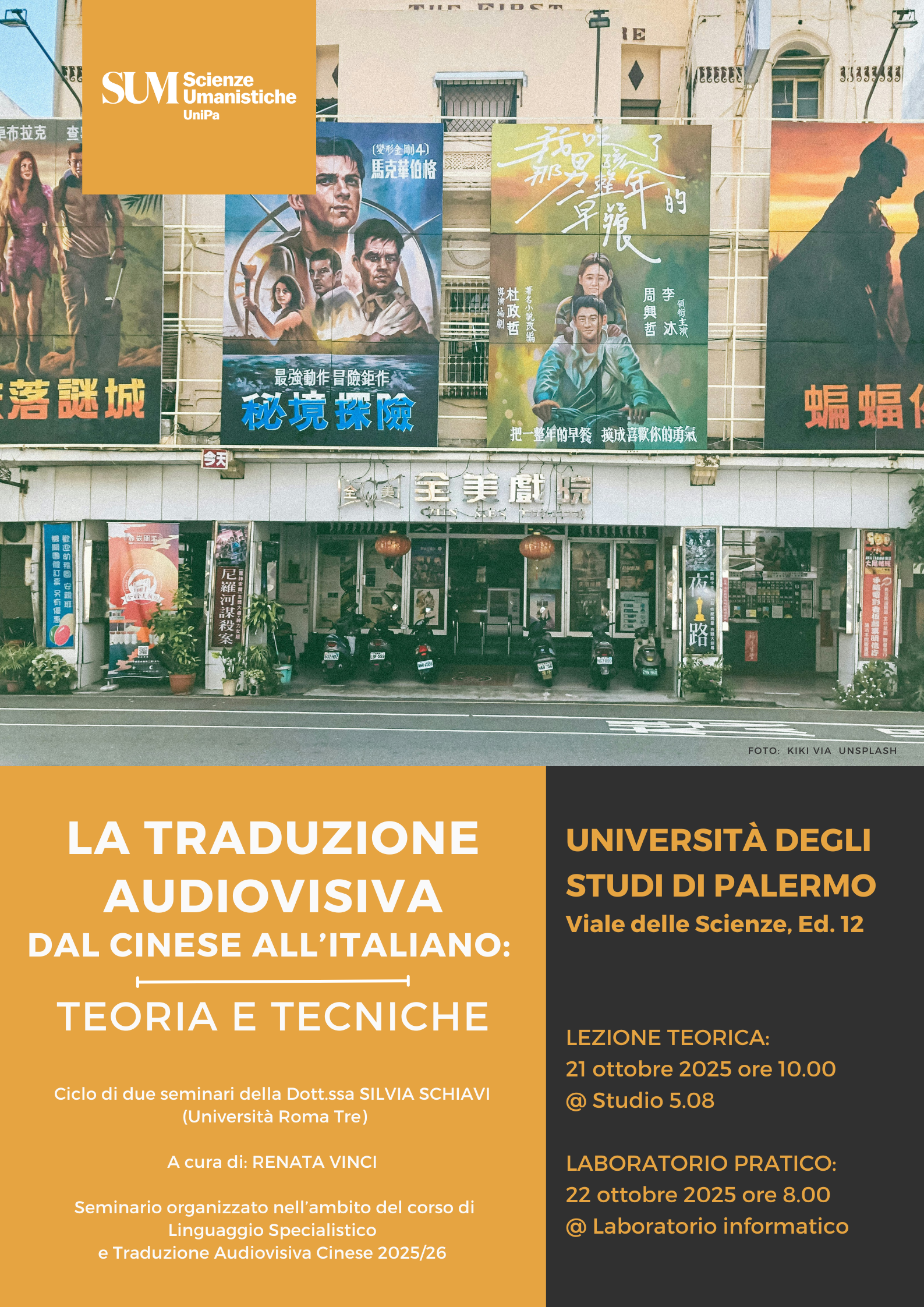 Si comunica che il 6 ottobre inizieranno le lezioni relative all'attività didattica integrativa ADI dell'insegnamento di Lingua, linguistica e traduzione cinese per il CdS magistrale Lingue moderne e traduzione per le relazioni internazionali Le lezioni dell'ADI saranno svolte dalla dott.ssa Stefania Profita e si svolgeranno il lunedì dalle 16 alle 18 in aula 109 Complesso Sant'Antonino e il giovedì dalle 17 alle 19 in aula C edificio 12 Viale delle Scienze.