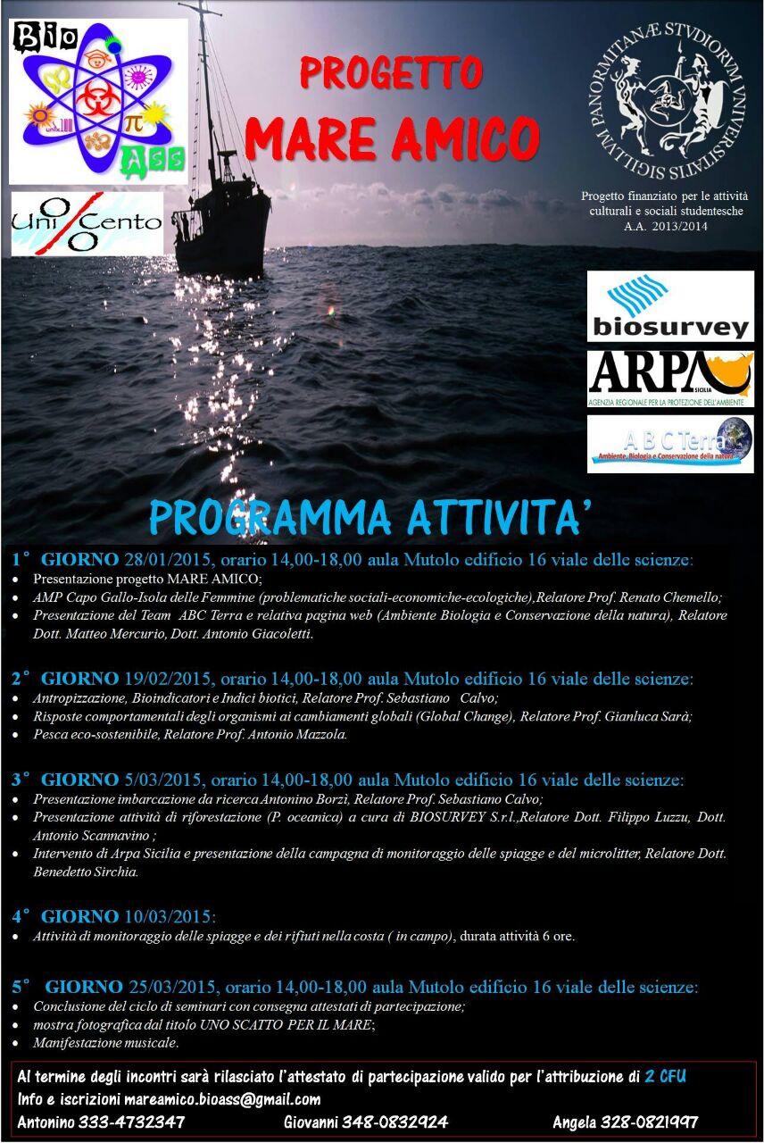Si informano gli studenti che la frequenza al ciclo di seminari del "Progetto Mare Amico" (locandina) è valida per l'attribuzione di 2 CFU nell'ambito delle "Altre conoscenze utili per l'inserimento del mondo del lavoro". A tale scopo dovrà essere consegnato in segreteria l'attestato di partecipazione insieme ad una breve relazione sull'oggetto dei seminari."