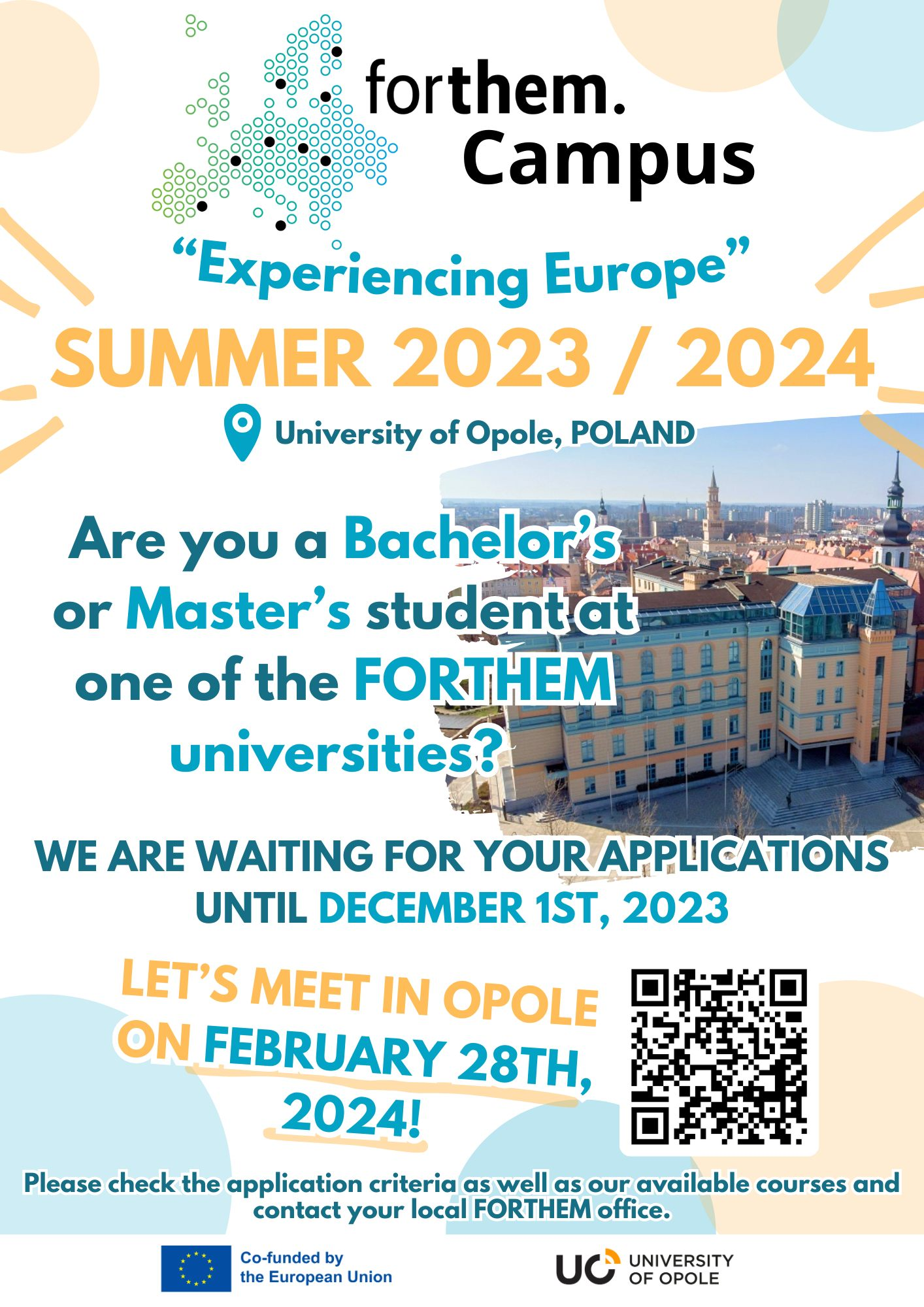 Il FORTHEM Campus della University of Opole riunisce studenti provenienti da tutta l’Alleanza e rappresenta una forma sperimentale ed innovativa di mobilità Erasmus+ per studio; si tratta di un programma interdisciplinare intensivo strutturato in 3 moduli (Disciplinare, Trasversale, Aperto) per un massimo di 30 crediti formativi (ECTS) complessivi sul tema “Experiencing Europe”. Il FORTHEM Campus si svolgerà dal 28 Febbraio 2024 al 14 Luglio 2024 (secondo semestre dell'a.a. 2023/2024).