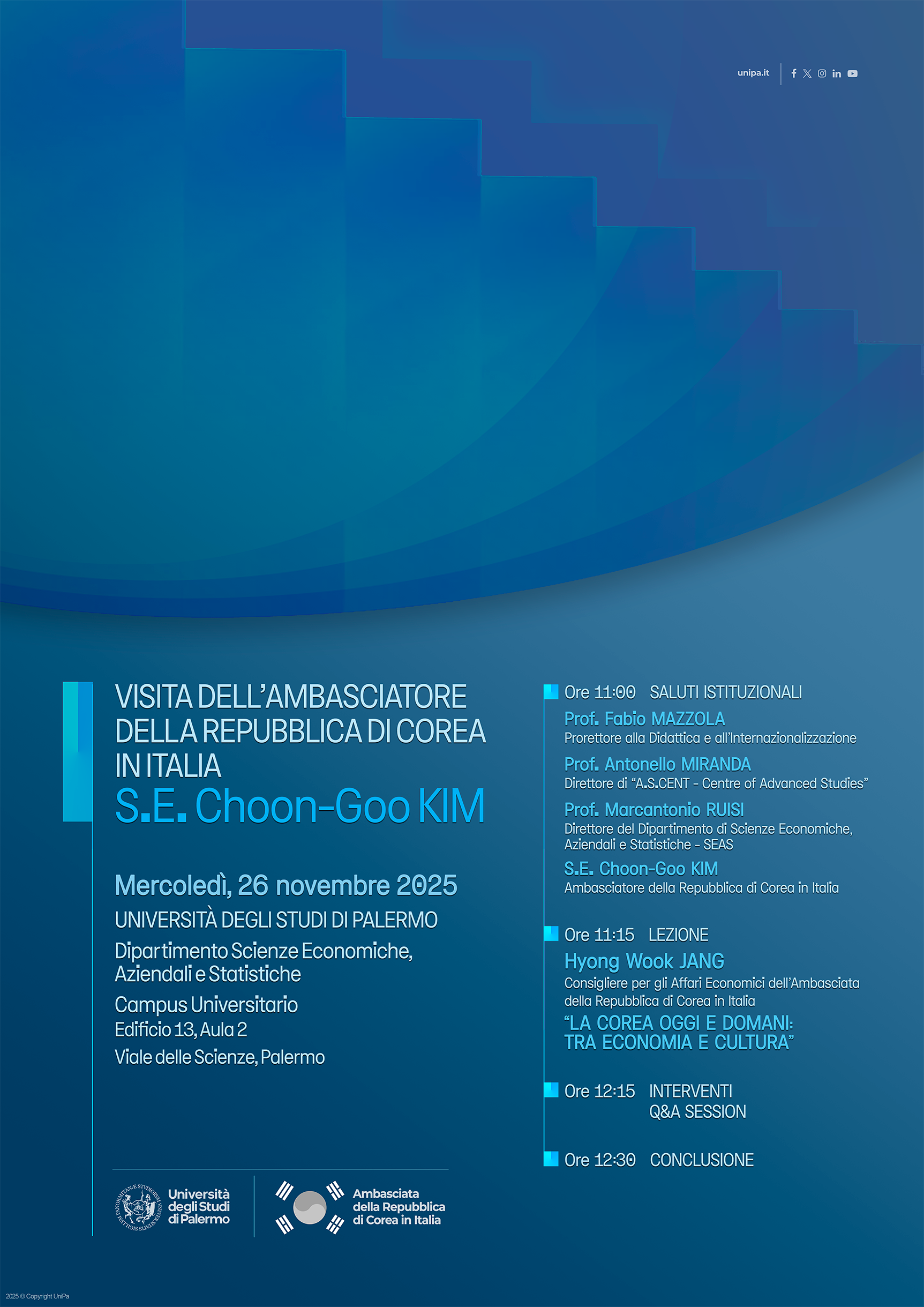 Mercoledì 26 novembre, alle 11.00, nell’Aula 2 del Dipartimento Scienze Economiche, Aziendali e Statistiche (Edificio 13, Campus di Viale delle Scienze) si tiene la lezione dal titolo “La Corea oggi e domani: tra economia e cultura”, a cura del sig. Hyong Wook JANG, Consigliere per gli Affari Economici dell’Ambasciata della Repubblica di Corea in Italia.