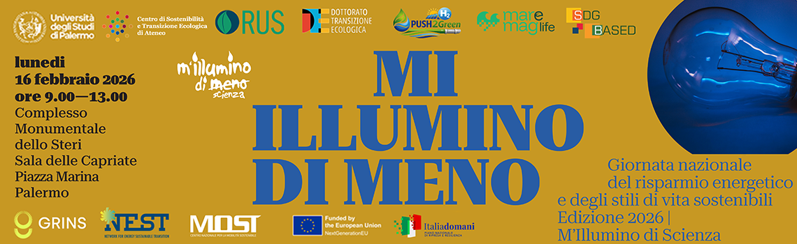Lunedì 16 febbraio 2026 dalle 9:00 alle ore 13:00 presso la sala delle Capriate del complesso dello Steri dell’Università di Palermo si svolgerà un seminario nell’ambito della manifestazione “M’illumino di Meno”, Giornata Nazionale del Risparmio Energetico e degli Stili di Vita Sostenibili, ideata nel 2005 da Rai Radio2 con la trasmissione Caterpillar. M’illumino di Meno si celebra ogni anno in febbraio per diffondere la cultura della sostenibilità ambientale e del risparmio delle risorse. La Giornata Nazionale del Risparmio Energetico e degli Stili di Vita Sostenibili è stata istituita dal Parlamento con la Legge n. 34/2022.