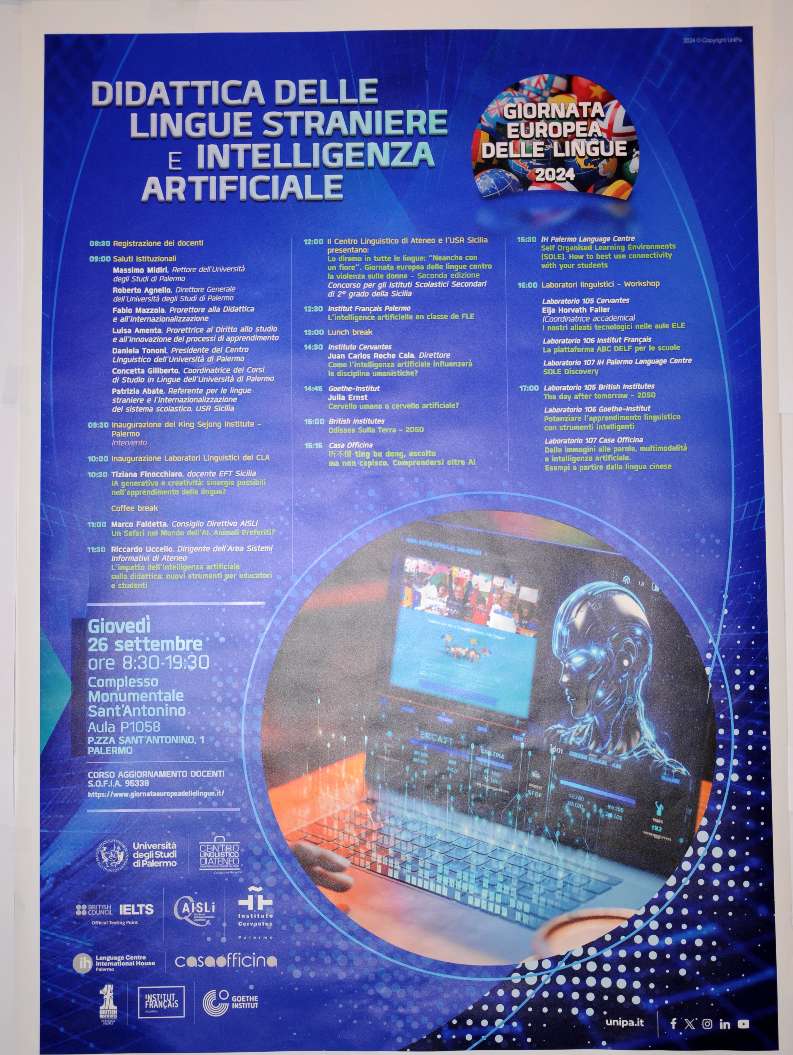 Nell'ambito delle iniziative della GEL 2024, il Centro Linguistico di Ateneo - CLA Palermo propone una riflessione su "Didattica delle lingue e AI" insieme ai centri e istituti di lingua del territorio. Il corso è rivolto ai docenti delle scuole e presente su S.O.F.I.A. (95338). Il 26 settembre saranno inaugurati anche i nuovi Laboratori Linguistici del CLA e presentata la seconda edizione del concorso per le Scuole "Lo diremo in tutte le lingue".