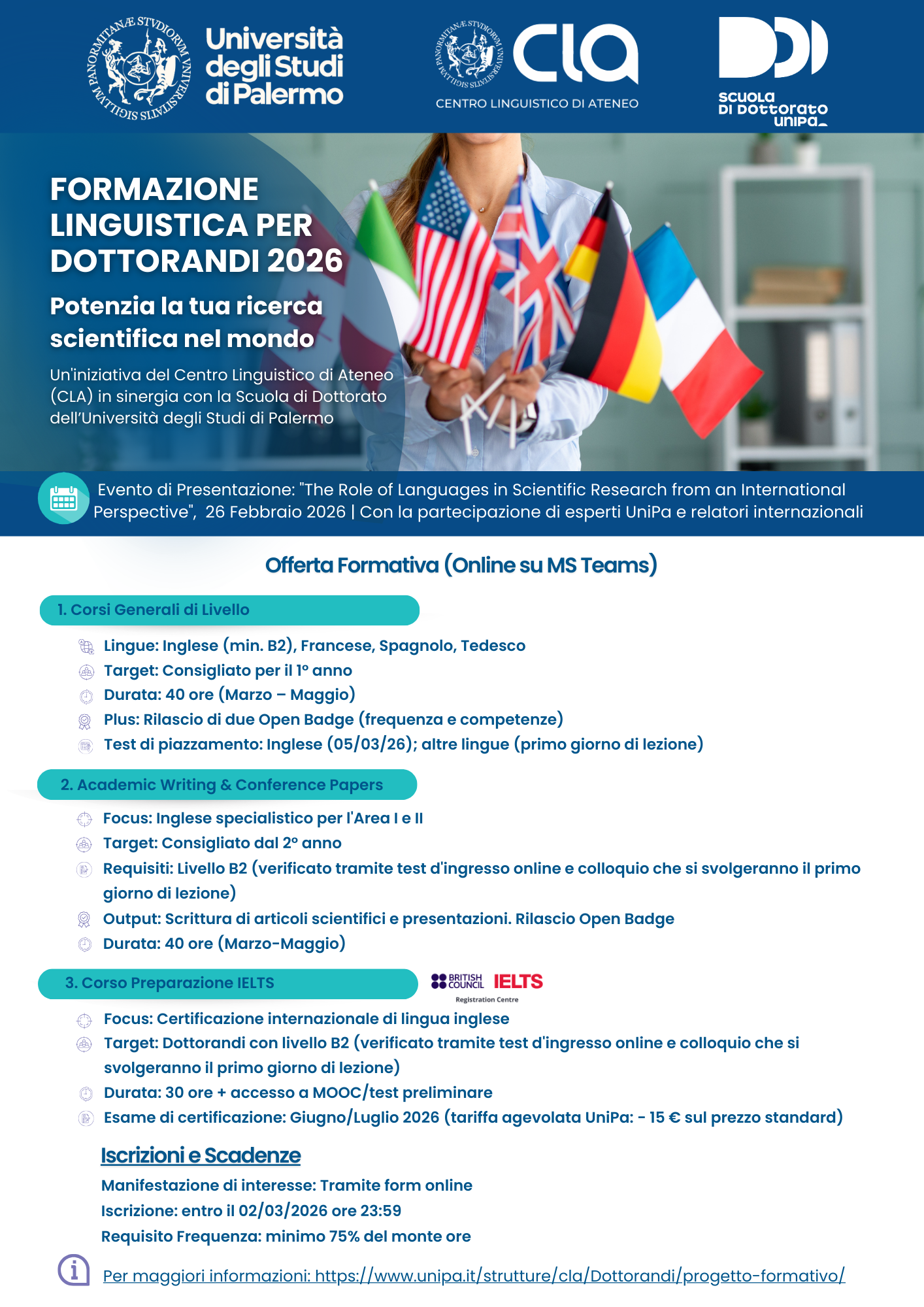 Il progetto sarà presentato nel corso della giornata informativa intitolata “Il ruolo delle lingue nella ricerca scientifica in prospettiva internazionale” prevista per il 26 febbraio 2026 e organizzata dal CLA con il contributo della Scuola di Dottorato.