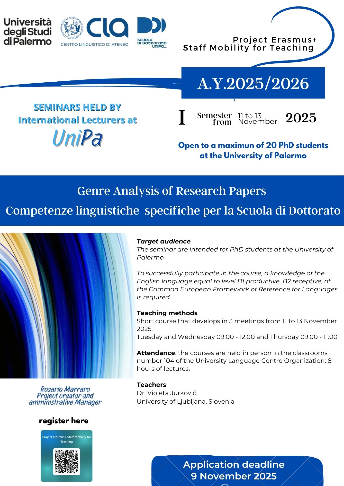 Project Erasmus+ Staff Mobility for Teaching - Phd students Ascolta 1 11 e 12 novembre ore 9.00-13.00 - 13 novembre ore 9.00-11-00 Scadenza presentazione domanda: 09/11/2025 Parole Chiave: cla, unipa, news